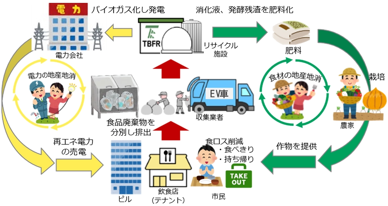 定禅寺通エリア周辺の中小飲食店等が排出する生ごみ(食品廃棄物)を分別収集し、バイオマス資源として活用する取組みです。生ごみを排出する際にカラス対策を講じ、収集には環境に優しいEVパッカー車を使用します。